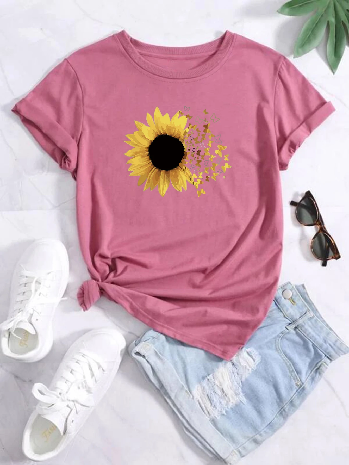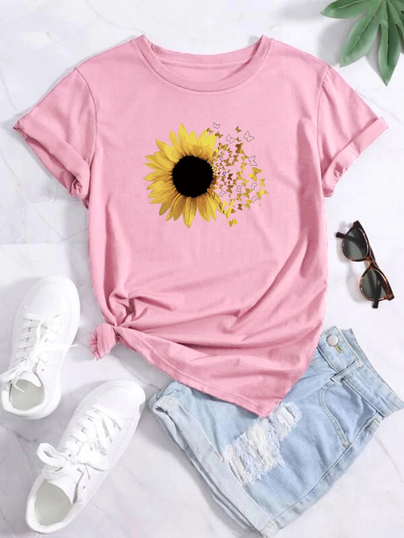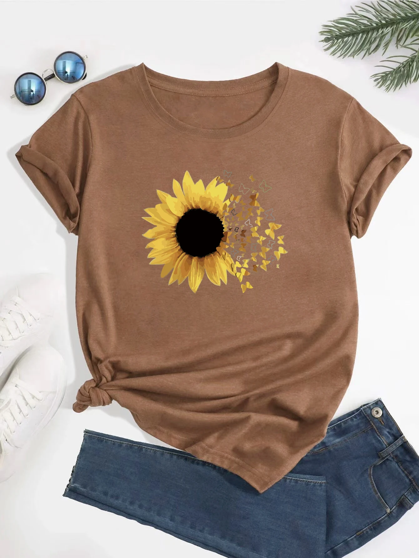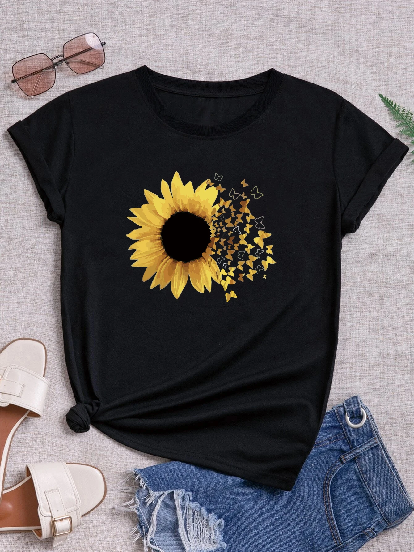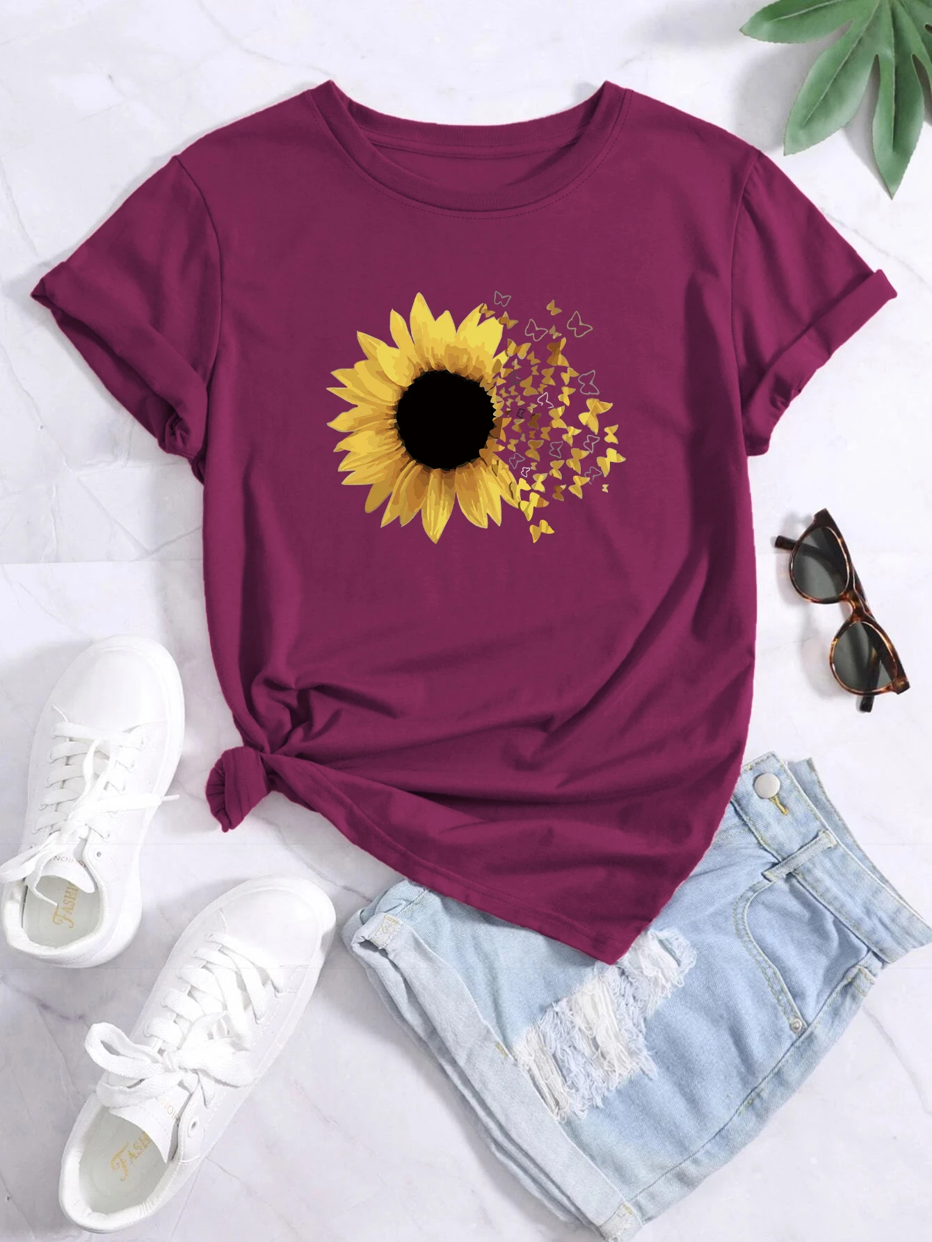 Sunflower Butterfly Print Crew Neck T-shirt, Casual Loose Short Sleeve Fashion Summer T-Shirts Tops, Women's Clothing