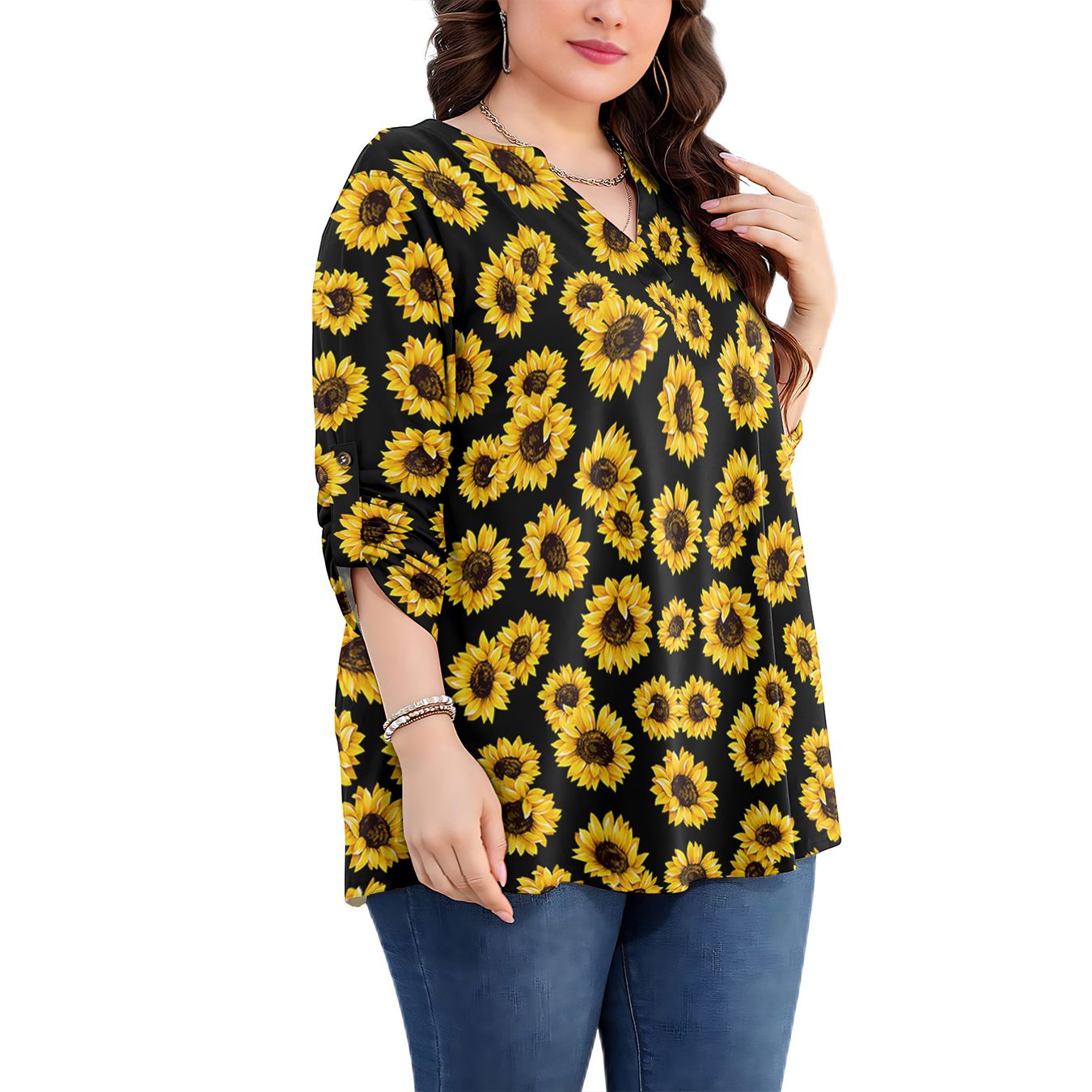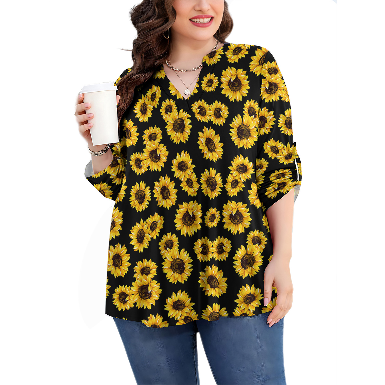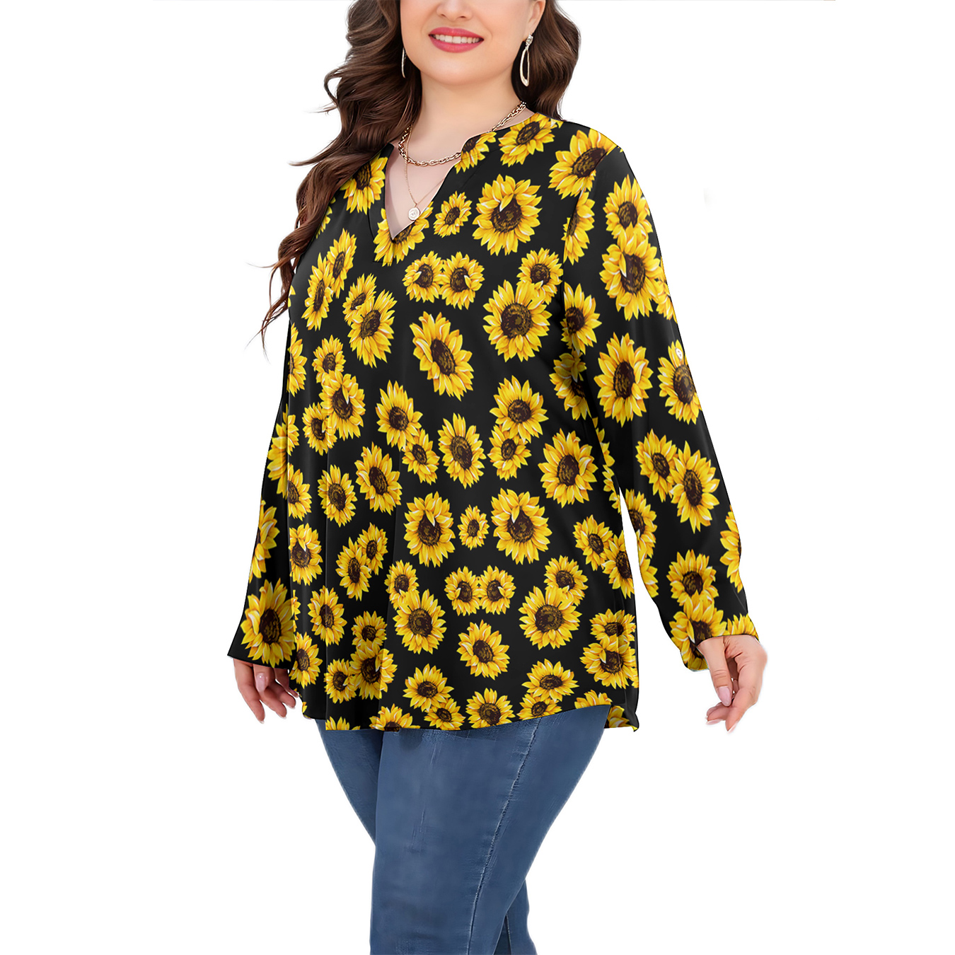 Women Plus Size T-shirt Sunflower Pattern Print Long Sleeved Autumn Tshirts Oversized V-neck Casual Tops