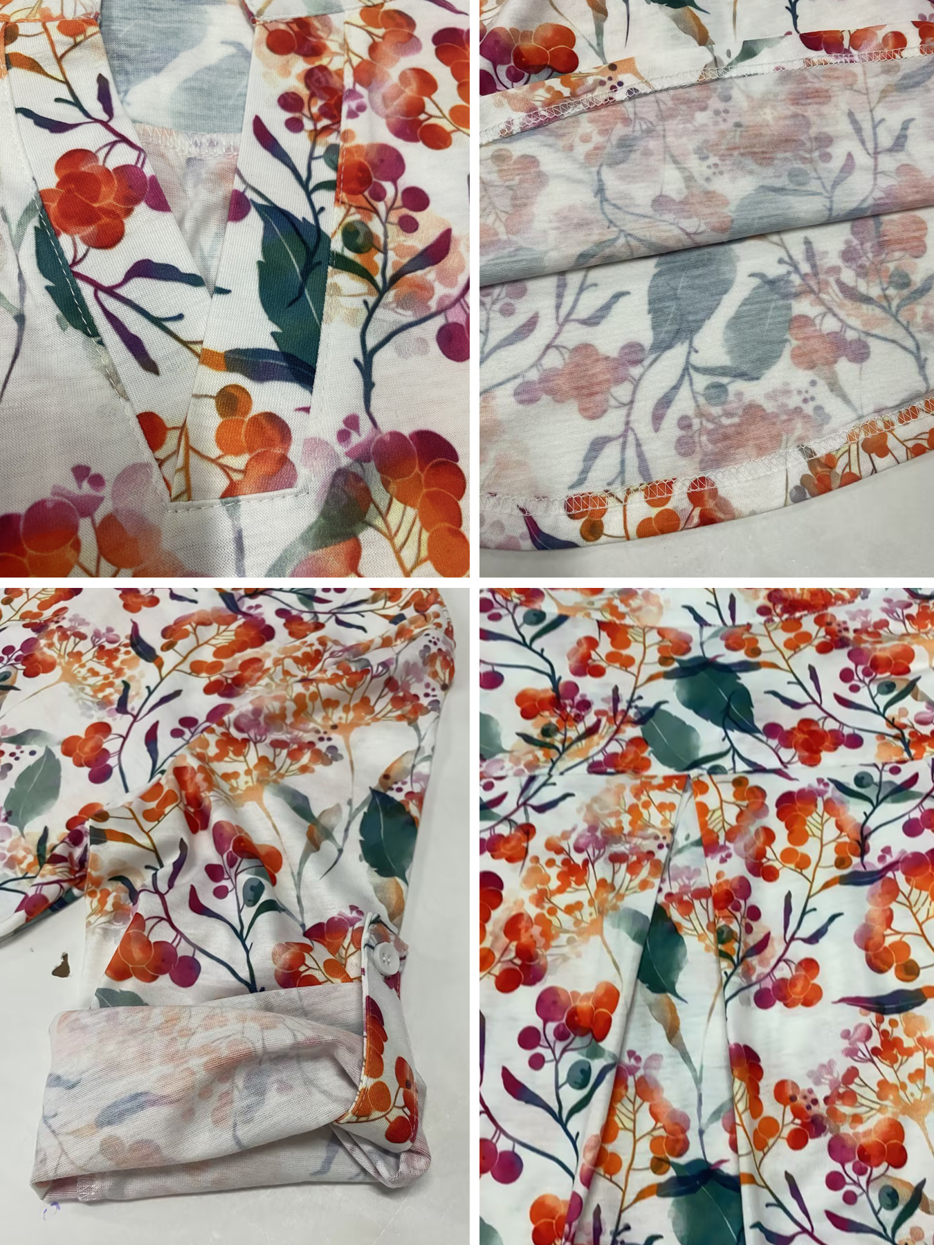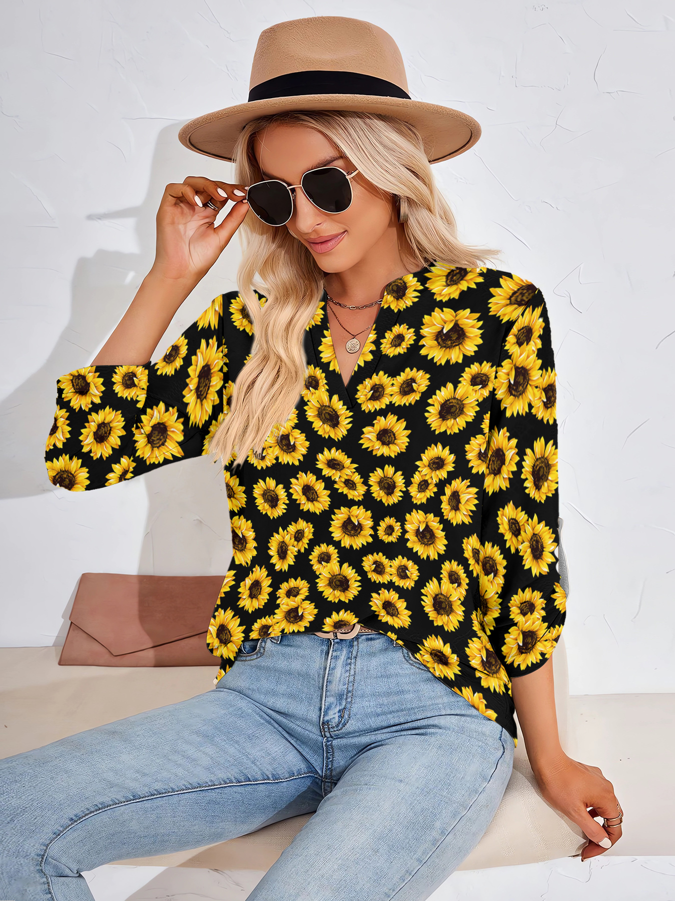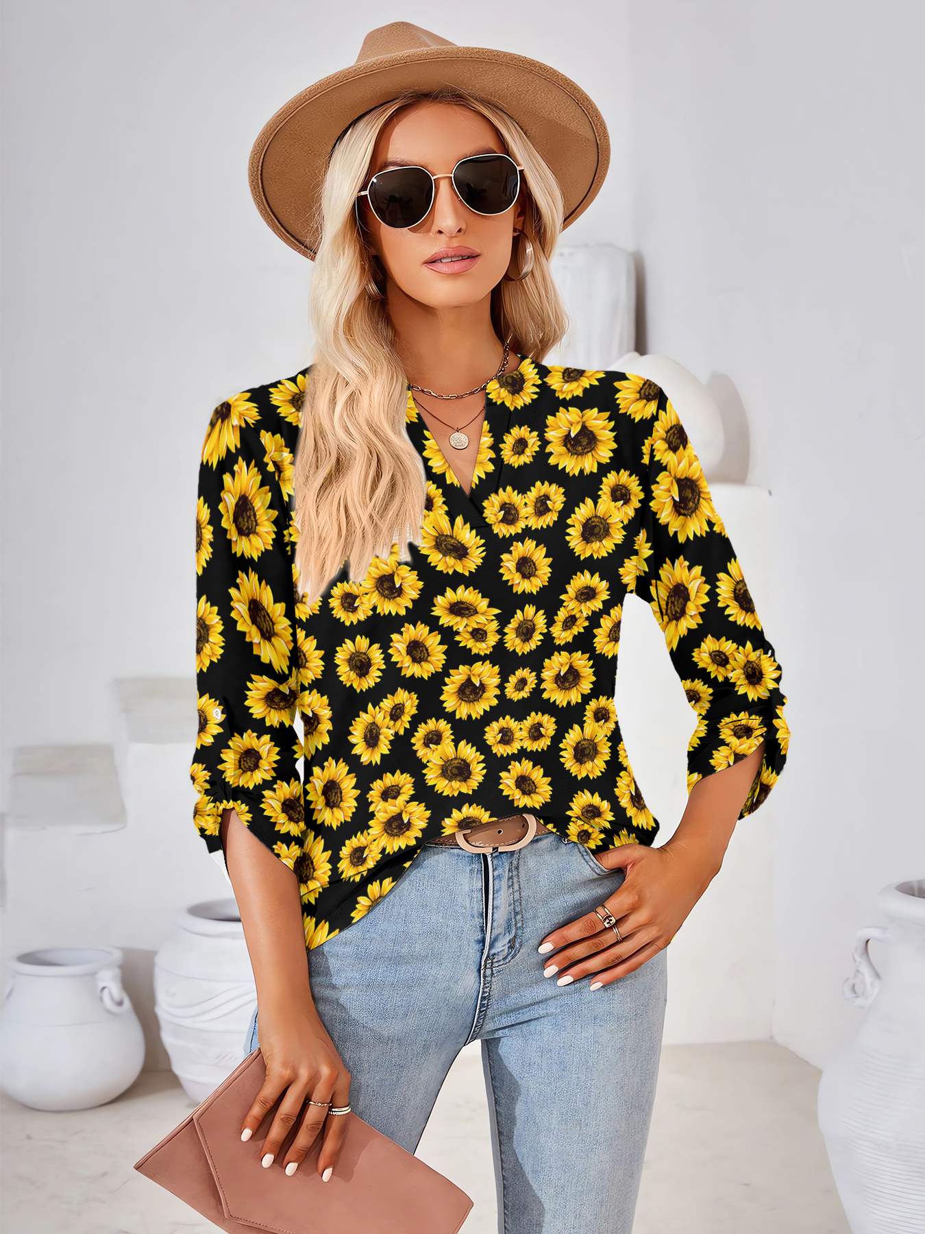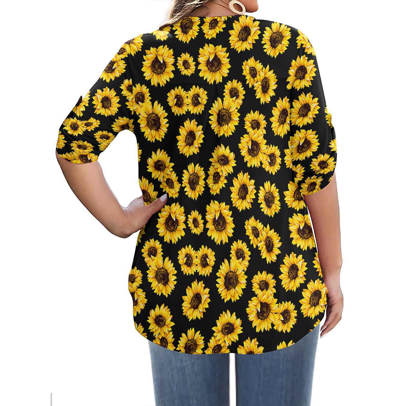 Women Plus Size T-shirt Sunflower Pattern Print Long Sleeved Autumn Tshirts Oversized V-neck Casual Tops